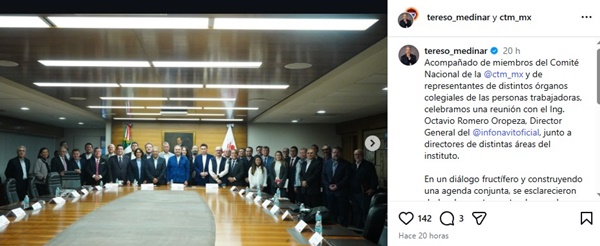 Tereso Medina, dirigente de la Confederación de Trabajadores de México (CTM), se reunió con el director general del Infonavit, Octavio Romero Oropeza, acompañado por integrantes del Comité Nacional y representantes de órganos colegiados de trabajadores, en un encuentro orientado a revisar inquietudes del sector laboral en materia de vivienda.