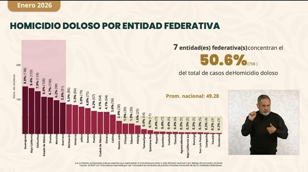 A nivel nacional, el informe señala que siete entidades concentran el 50.6 por ciento de los homicidios dolosos: Guanajuato, Baja California, Chihuahua, Estado de México, Sinaloa, Morelos y Guerrero. El promedio nacional durante enero fue de 49.28 homicidios diarios.